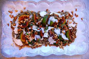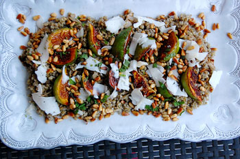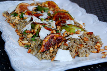 Freekia Salad with Caramelized Onions, Figs, Goat Cheese, and Pine Nuts
